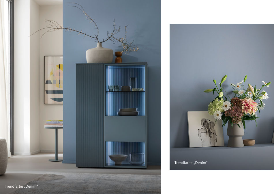 Auch bei unseren Trendfarben wirst Du fündig: Denim zum Beispiel wirkt luftig-leicht und lässig. Alle drei Farben lassen Räume zugleich größer erscheinen, da blaue Wände weiter entfernt wirken.