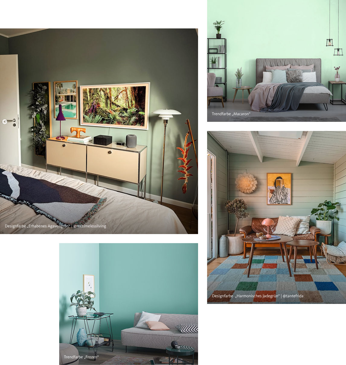 Aber auch Grüntöne wie Erhabenes Agavengrün, Ruhiges Salbeigrün oder Harmonisches Jadegrün wirken auf das menschliche Auge erholsam und erfrischend zugleich. Und das frostige Türkisblau Frozen sowie das kühle Mintgrün Macaron sind perfekte Trendfarben, um sich an heißen Tagen zu erholen.