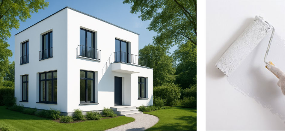 Helle Farben reflektieren mehr Sonnenlicht als dunkle. Weiße Fassadenfarbe ist daher ein wirksames Mittel gegen das Aufheizen von Häusern. Du solltest die Fassade regelmäßig säubern und bei Bedarf neu streichen, denn Wind und Wetter, UV-Strahlung, Staub und Algen setzen den Außenflächen zu und verringern die Fähigkeit, Licht zu reflektieren. Im Sortiment von SCHÖNER WOHNEN-Farbe stehen Dir drei verschiedene Fassadenfarben zur Verfügung, die unterschiedliche Anwendungsbereiche abdecken – für den perfekten Fassadenschutz.