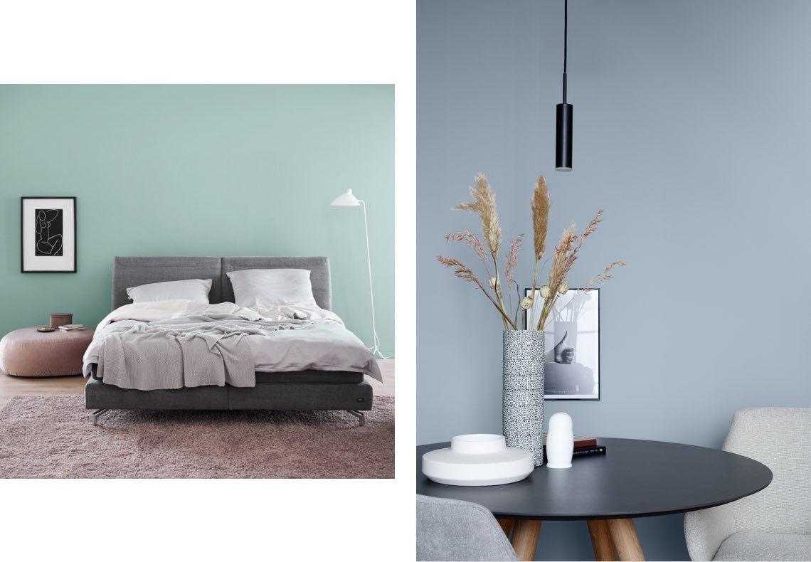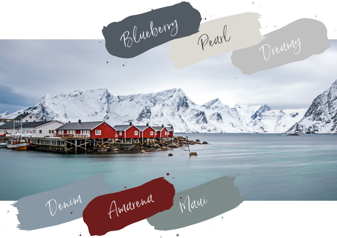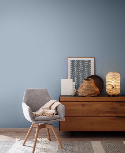 Aber auch helles Blau oder Türkis sind definitiv die richtigen Farben, um ein skandinavisches Ambiente zu schaffen – zum Beispiel unsere Trendfarben Denim und Maui, die an die facettenreichen Farben des Meeres erinnern. Akzente setzt Du ganz einfach mit dem Beerenblau von Blueberry oder dem fruchtigen Rot von Amarena.