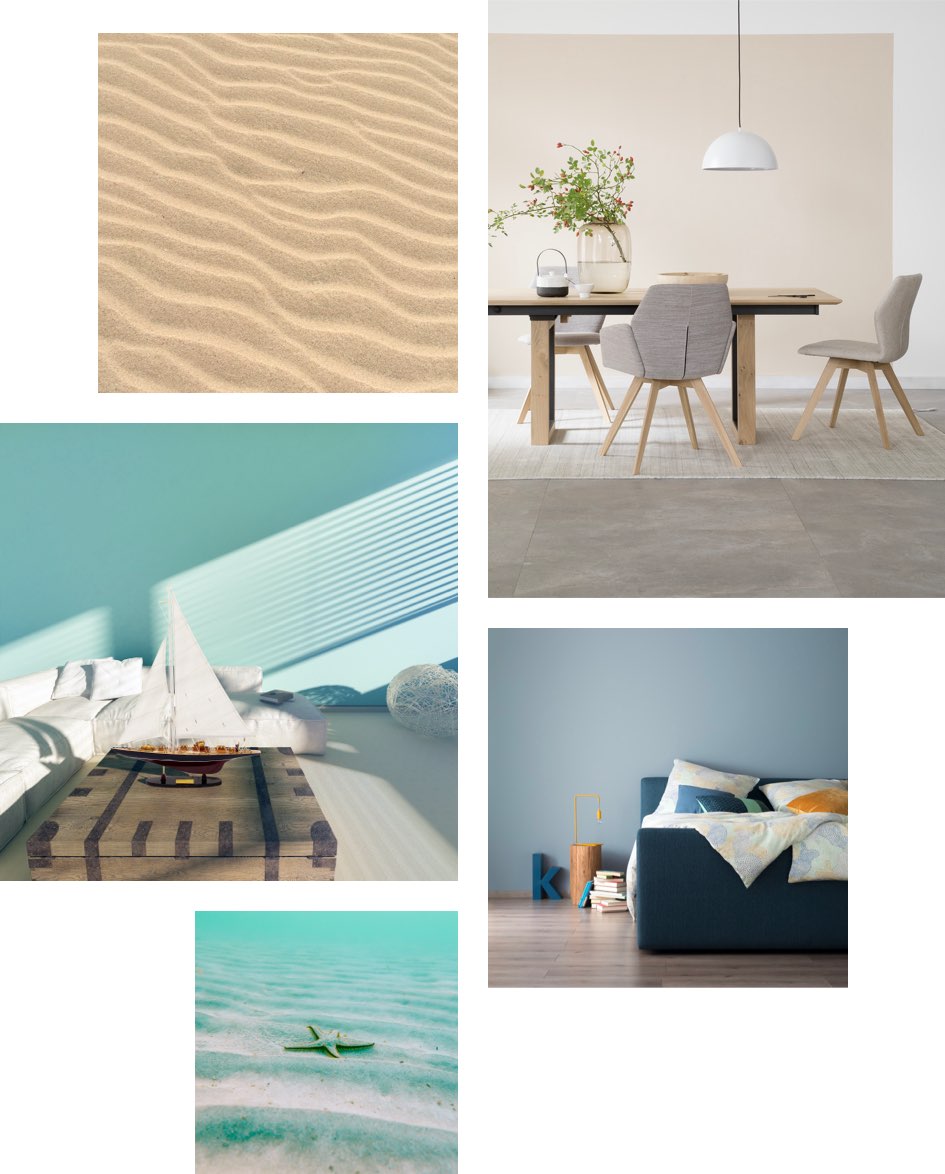 Viele denken beim maritimen Stil an die Farbkombination Blau-Weiß – Blau wie das Meer und der Himmel und Weiß wie Wolken oder die Segel schnittiger Yachten. Diese Farbgestaltung stammt tatsächlich aus der Seefahrt und findet sich dort zum Beispiel heute noch im Design von Uniformen in Marineblau mit weißen Hemden. Alternativ zu diesen sehr klaren Farben gibt es noch weitere Töne, mit denen Du zu Hause eine offene, luftig-leichte Atmosphäre schaffst: Sand- oder Steintöne neben ausgewaschenem Indigo oder Petrol zum Beispiel. Oder Seite an Seite mit einem hellen Türkisgrün wie der Trendfarbe Frozen. Die Strandwirkung unserer Trendfarbe Sand lässt sich mit passenden Möbeln und Fundstücken aus dem Meer noch unterstreichen. Warmes Licht betont den dezenten Charakter dieser Trendfarbe und macht die Wohlfühlatmosphäre perfekt. Dabei wirkt Sand jedoch immer modern und klar. In unserer Designfarben Kollektion findest Du eine schöne Auswahl an Blautönen mit maritimem Charakter. Als Akzentfarbe eignen sich Rottöne, zum Beispiel ein angesagtes Korallenrot.