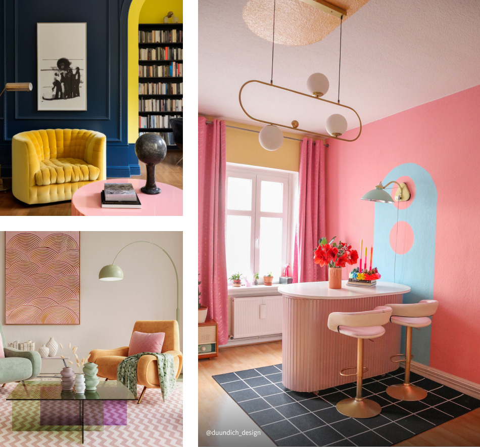 Farben spielen eine wichtige Rolle im Maximalismus. Kräftige Töne und Kontraste schaffen eine lebendige und energiegeladene Atmosphäre. Vielfalt ist angesagt und wenn die Farben miteinander in einen dynamischen Austausch gehen, dann erweckt das den Raum zum neuen Leben. Mit dem SCHÖNER WOHNEN Colour Designer kannst Du verschiedene Farbtöne schon vor dem Streichen kombinieren und ihre Wirkung in Deinen vier Wänden testen.