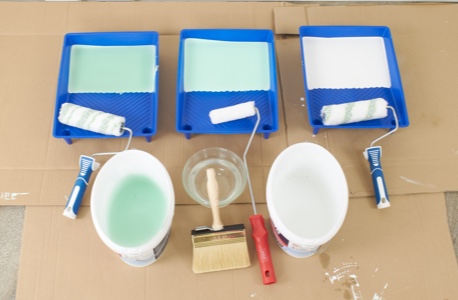 • drei Farbwannen und -rollen, Rührstab