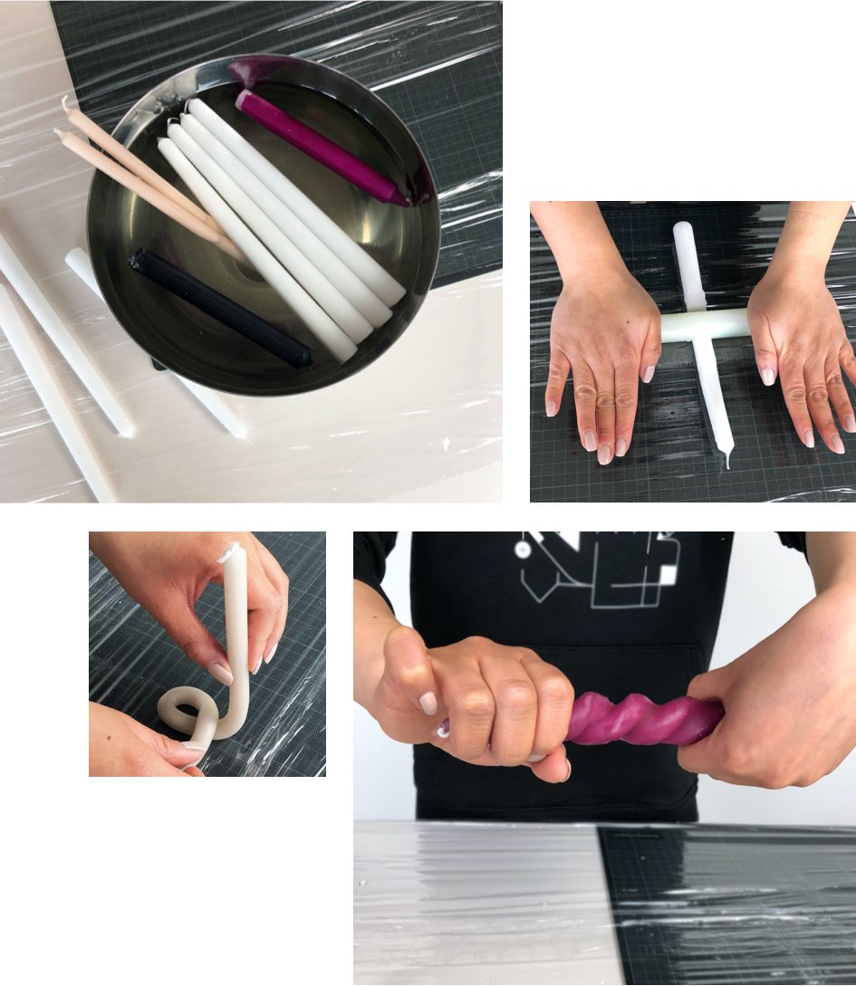 Für Deine eigene Kerzenkreation nimmst Du gewöhnliche Kerzen und machst aus diesen etwas Besonderes. Es ist ganz einfach: Stell die Kerzen einige Minuten in einen Behälter mit warmem Wasser. Das Wasser darf nicht zu heiß sein, sonst schmelzen die Kerzen. Ist das Wachs warm genug, lässt sich die Kerze vorsichtig biegen oder zu einer Twisted Candle drehen. Bevor Du die Kerze in sich verdrehst, solltest Du sie jedoch etwas flach drücken, z. B. mit einem Nudelholz oder einer leeren Glasflasche. Achte darauf, dass das untere Ende noch in Deinen Kerzenhalter passt. Vorsicht: Sobald das Wachs abkühlt, bricht die Kerze beim Biegen oder Drehen leicht. Wärme sie dann lieber nochmal kurz im Wasserbad auf.