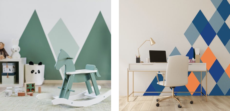 Oder Du gehst einen Schritt weiter und probierst es mit geometrischer Wandgestaltung. Dabei kombinierst Du zwei oder mehr Designfarben miteinander, indem Du sie z. B. in Form von Rauten oder Waben an die Wand bringst. Die Umsetzung ist einfach: Zeichne mit Wasserwaage, Zollstock und Bleistift ein Muster auf die Wand und klebe die einzelnen Flächen mit Malerkrepp ab. Dann wird gestrichen. Willst Du die Muster noch mehr betonen, klebst Du schmale Holzleisten zwischen die Flächen auf die Wand.