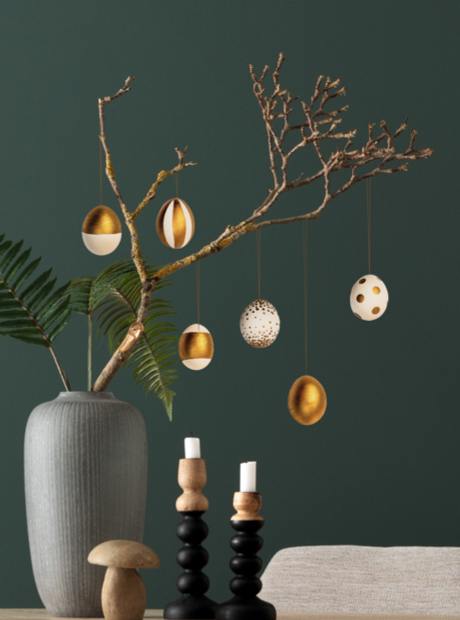 Wie beim Blumenbouquet erzeugen Sie durch den Mix unterschiedlicher Materialien Spannung. Arrangieren Sie zum Beispiel goldglänzende Eier und etwas Grün in einer Vintage-Keramikschale vom Flohmarkt. Sie haben keine Zeit oder Lust Eier zu färben? Unser Tipp: Mit Masking-Tape lassen sich Eier im Handumdrehen verschönern. Eine große Auswahl an Farben und Mustern finden Sie in jedem Büro- oder Bastelgeschäft.