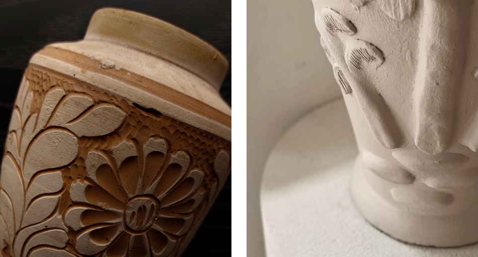 Manche Gefäße haben nach dem Brennen eine leicht poröse Oberfläche. Das hängt mit der verwendeten Tonart und der Brenntemperatur zusammen. Terracotta beispielsweise ist Keramik, die bei niedrigen Temperaturen gebrannt und anschließend nicht glasiert wird. Dadurch behalten die Gegenstände ihre erdigen Naturtöne wie Braun und Beige.