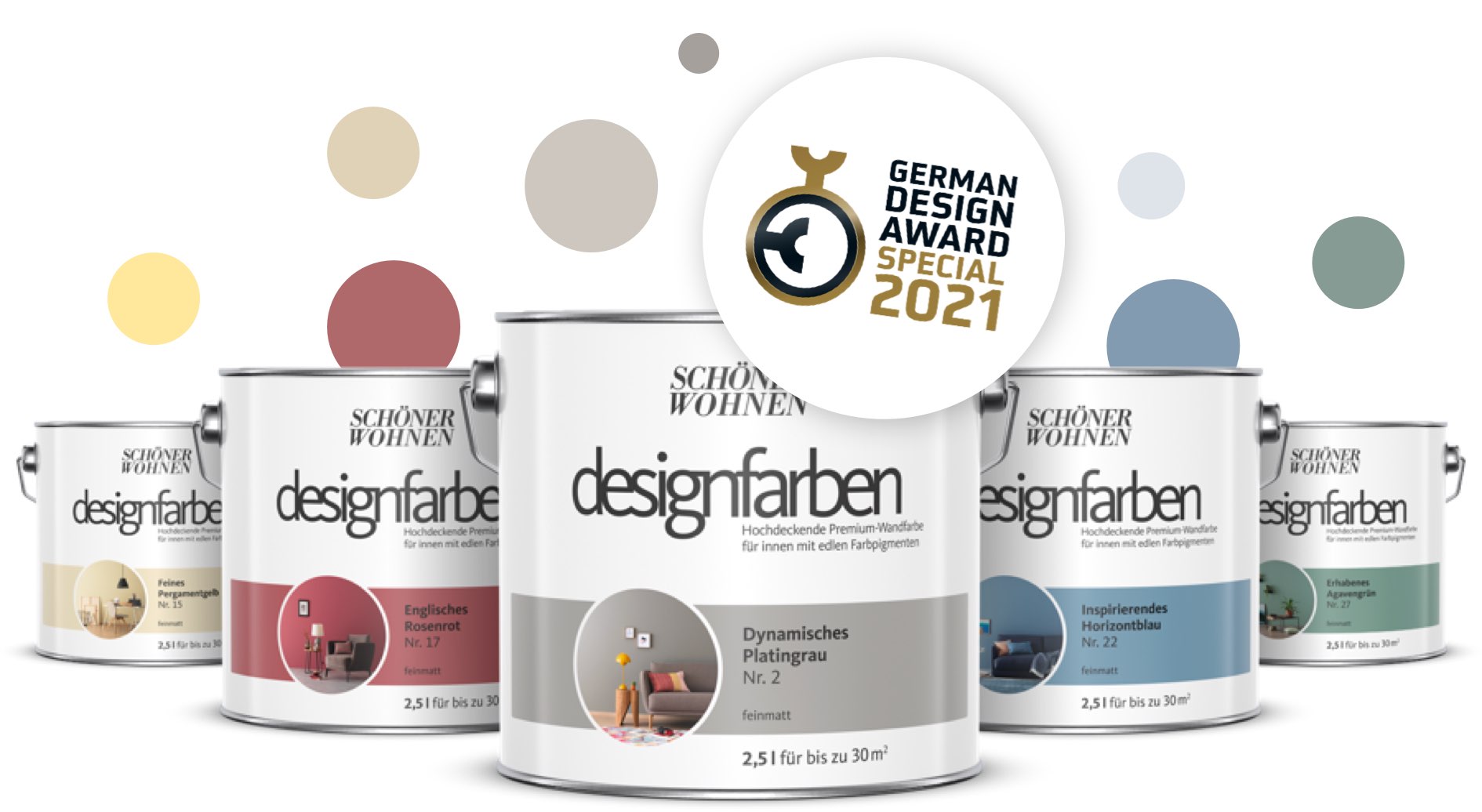 Mit dem German Design Award werden seit 2012 innovative Produkte und Projekte sowie ihre Hersteller und Gestalter ausgezeichnet, die in der deutschen und internationalen Designlandschaft wegweisend sind. Für die herausragende Designqualität wurden die SCHÖNER WOHNEN Designfarben nun mit dem German Design Award 2021 ausgezeichnet. Das ist natürlich eine tolle Bestätigung für unsere Entwickler. Auch wenn sie die Experten gerne beeindrucken – viel wichtiger ist ihnen, die Kundinnen und Kunden zu überzeugen. Also Dich!