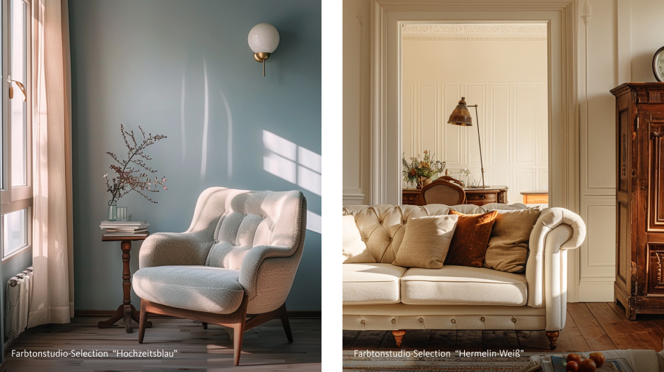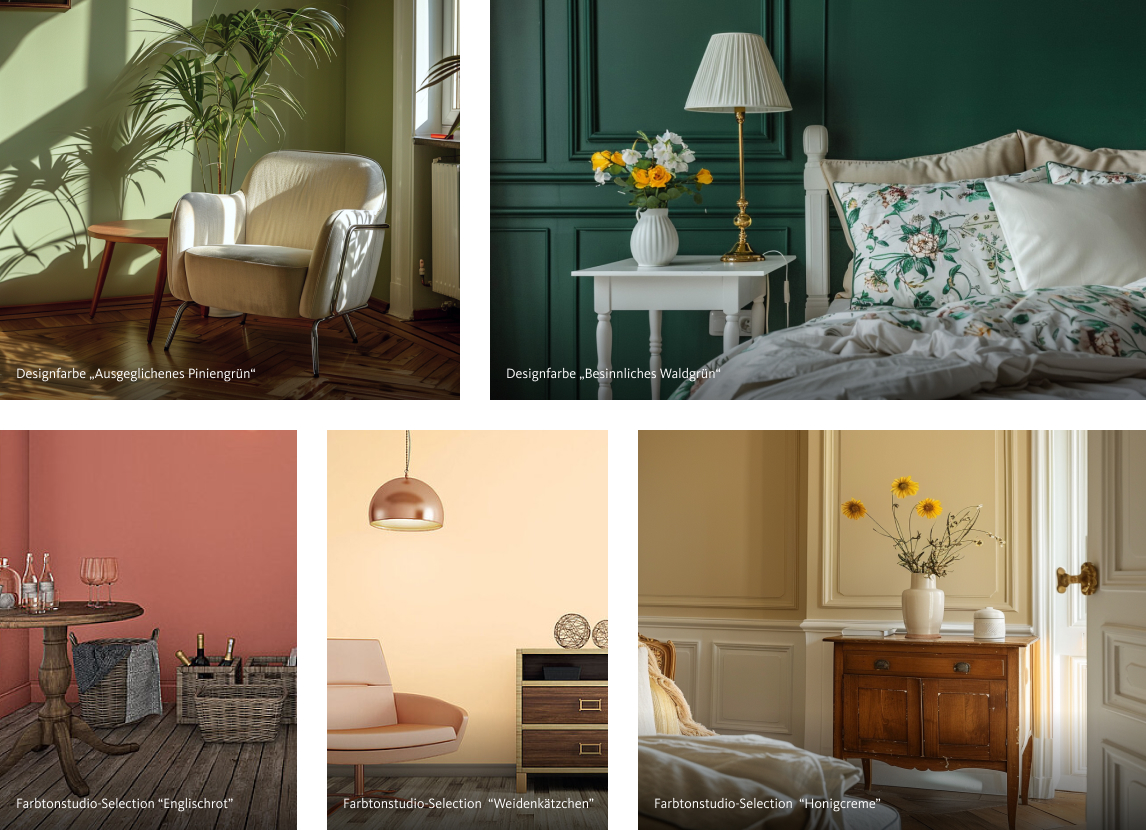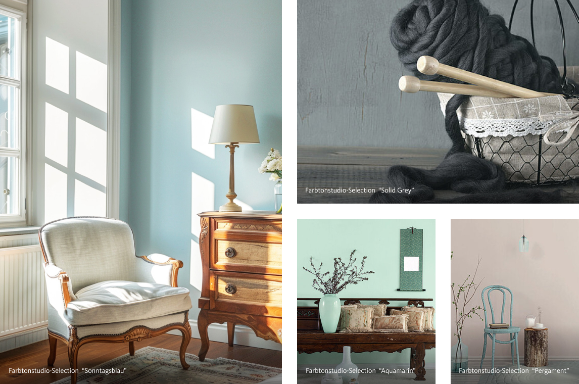 Besonders traditionell wirken Farbtöne wie Blau- und Grautöne. Tolle Akzentfarben dazu sind warmes Rot oder Honiggelb. Oder Du entscheidest Dich für einen kräftigen Ton als Basisfarbe für den gesamten Raum. Grün wirkt zum Beispiel besonders gut in Verbindung mit Holz, Leder, Leinen und Wolle. Sieh Dir unbedingt unsere Designfarben Ausgeglichenes Piniengrün Nr. 28 oder Besinnliches Waldgrün Nr. 26 an. Dank der passenden Grundierfarbe kannst Du mit diesem Ton auch dekorative Elemente wie Stuckleisten, Bilderrahmen oder Holzpaneele streichen und so einen nostalgischen All-Over-Look kreieren.