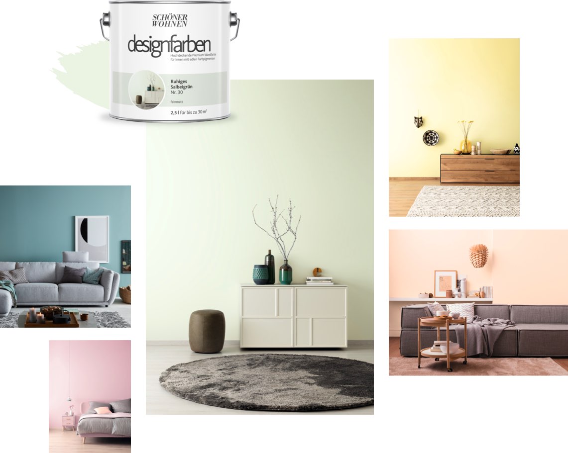 Sonniges Pastellgelb und warmes Apricot schaffen eine freundliche, warme Atmosphäre. Zu Gelb passen zum Beispiel erdige Töne oder etwas kühlere Farben wie Mintgrün, Hellblau und Flieder. Zu Apricot passen auch kräftigere Orangerot-Töne als Akzent. Blütenrosa ist zwar weniger anregend als Rot, hat sich aber eine gewisse Romantik bewahrt, wirkt zart und anschmiegsam und ist außerdem besonders wandelbar in Kombination mit anderen Pastelltönen wie Frühlingsgrün. Hellblau lässt sich wunderbar mit Sand- oder Erdtönen kombinieren, während Flieder neben Mintgrün oder Gelb zur echten Stilikone wird. Mintgrün wirkt sowohl edel – in Kombination mit Goldtönen oder Grau zum Beispiel – oder sommerlich frisch zusammen mit hellem Gelb oder Weiß. Ruhiges Salbeigrün aus unserer Designfarben Kollektion strahlt Ruhe aus und spendet zugleich Kraft. Dieser Farbton bereichert dein Zuhause auf natürliche Weise – besonders Seite an Seite mit Weiß.