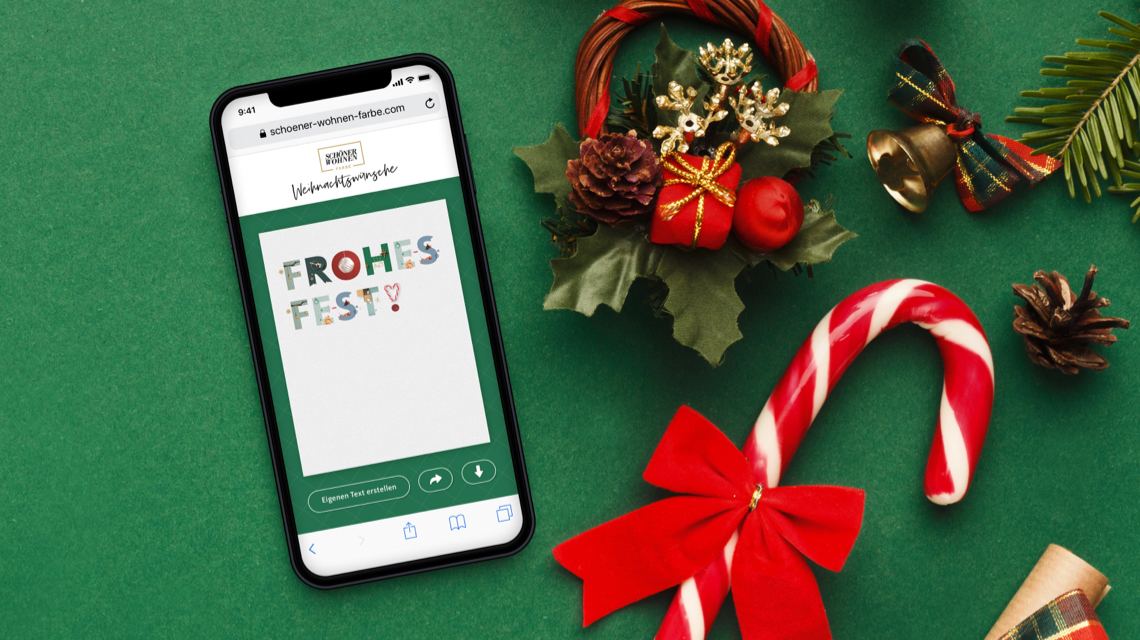 Wenn Du Deine Weihnachtswünsche gerne digital versenden möchtest, dann gestalte sie doch mit SCHÖNER WOHNEN-Farbe. Auf unserer Webseite kannst Du eine persönliche Nachricht eingeben, Deine Karte dann herunterladen und zum Beispiel per E-Mail verschicken oder direkt online teilen.