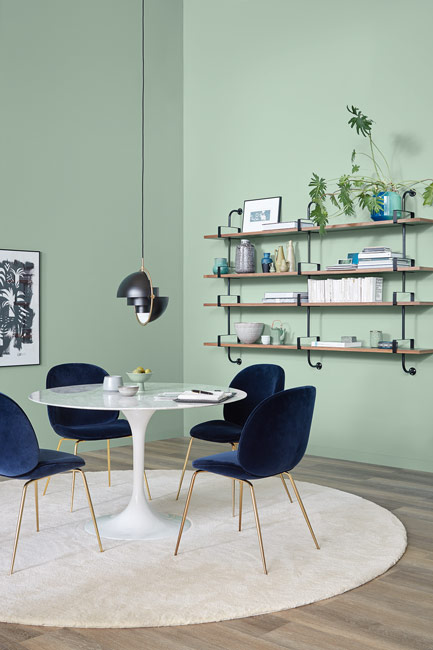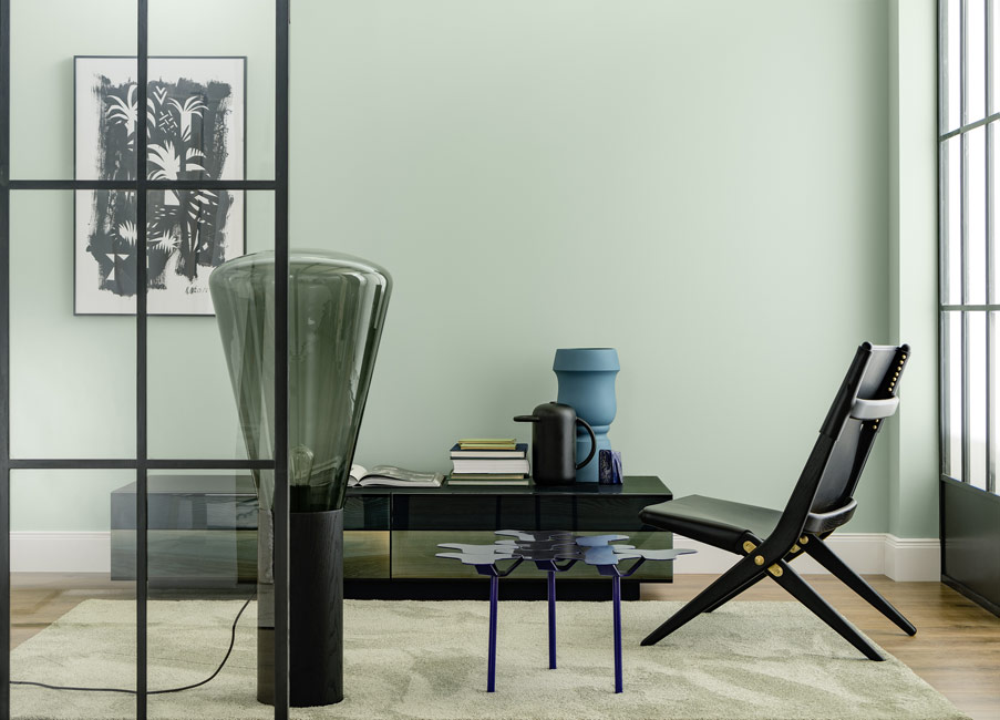 Grün eignet sich für Räume, in denen man Erholung sucht, denn die Farbe stellt eine Verbindung zur Natur her. Für das menschliche Auge ist Grün entspannend.