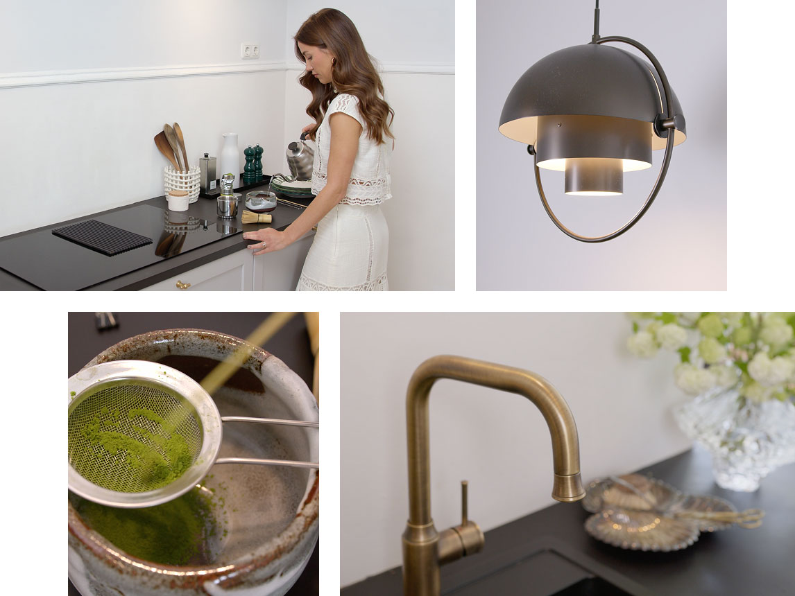 In der Küche ergänzt Johanna Weiß, Beige und Holztöne durch einzelne, geschickt eingesetzte Farbhighlights und Kontraste. Die schwarze Arbeitsfläche und die goldfarbene Armatur stehen zum Beispiel im Kontrast zu den hellen Wänden. Dieser kühlen Strenge setzt Johanna sogleich einige eher unprätentiöse Einrichtungsgegenstände entgegen: Die Brettchen aus Olivenholz, das bunt gestreifte Geschirr und der Hocker mit Korbsitzfläche könnten direkt aus einer Finca auf Ibiza stammen.