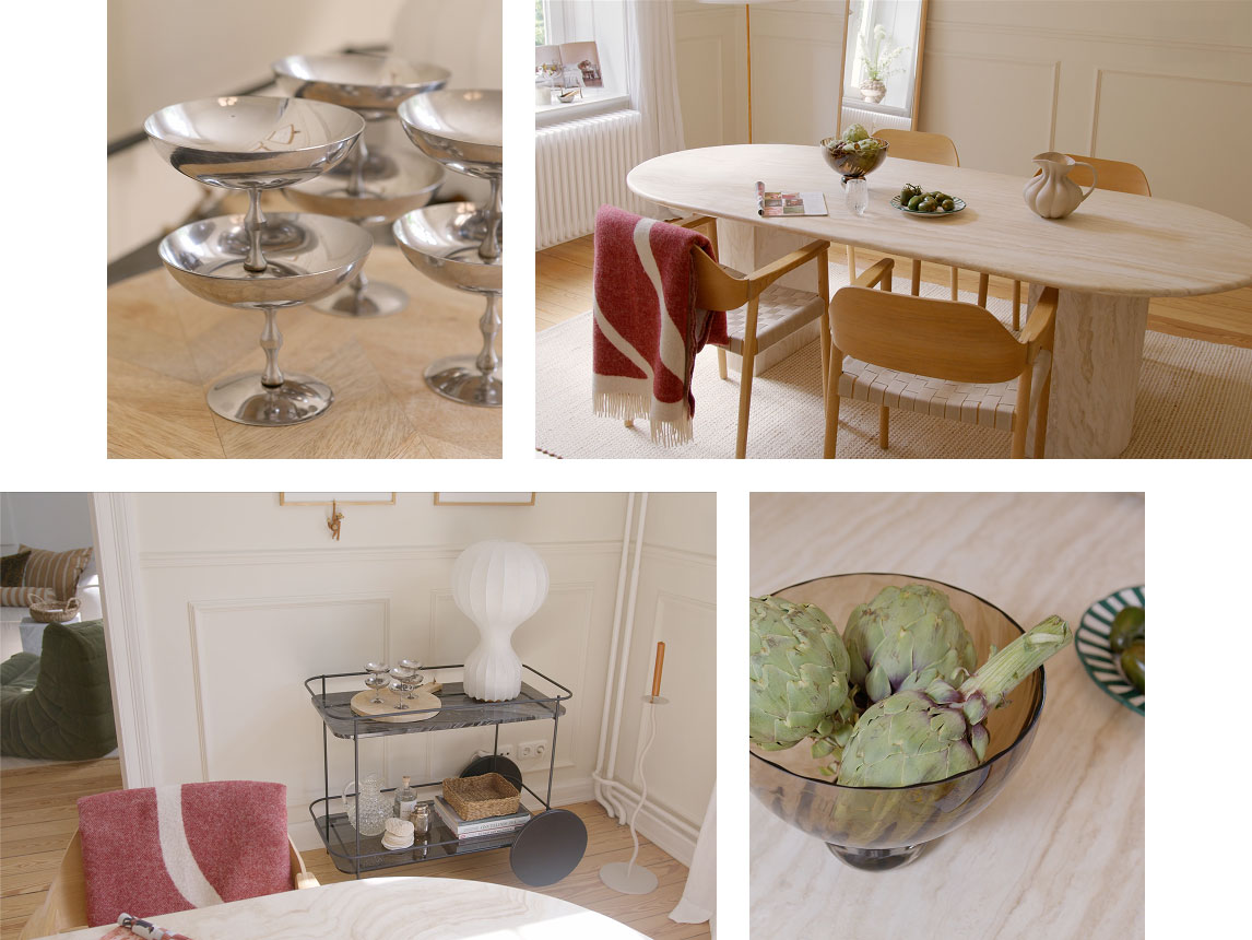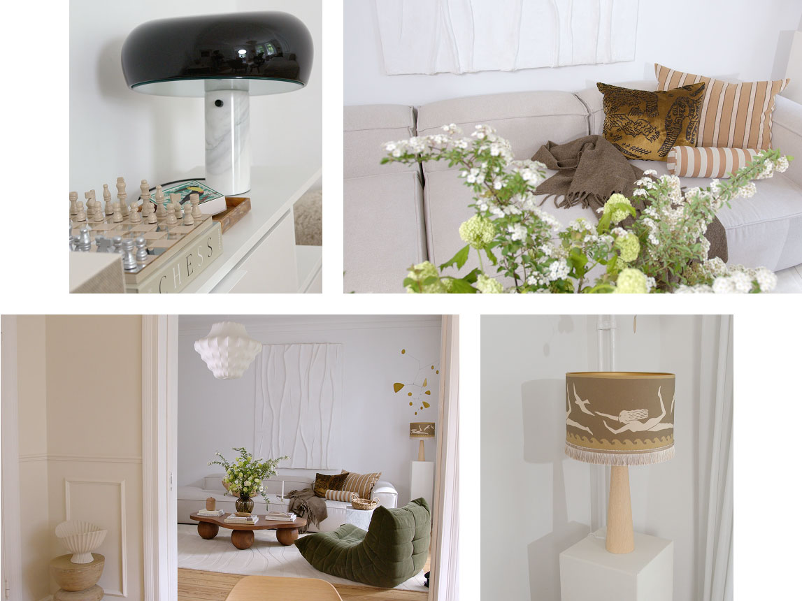Auch in diesem Raum erzeugt Johanna Spannung – diesmal aber durch die Auswahl an Formen. So setzt sie die kugelförmigen Beine vom Couchtisch in Kontrast zum eckigen Beistelltisch aus hellem Marmor. Der wunderschöne grüne Samtsessel und elegant bestickte Samtkissen brechen das skandinavische Feeling des fellbezogenen Hockers spielerisch auf.