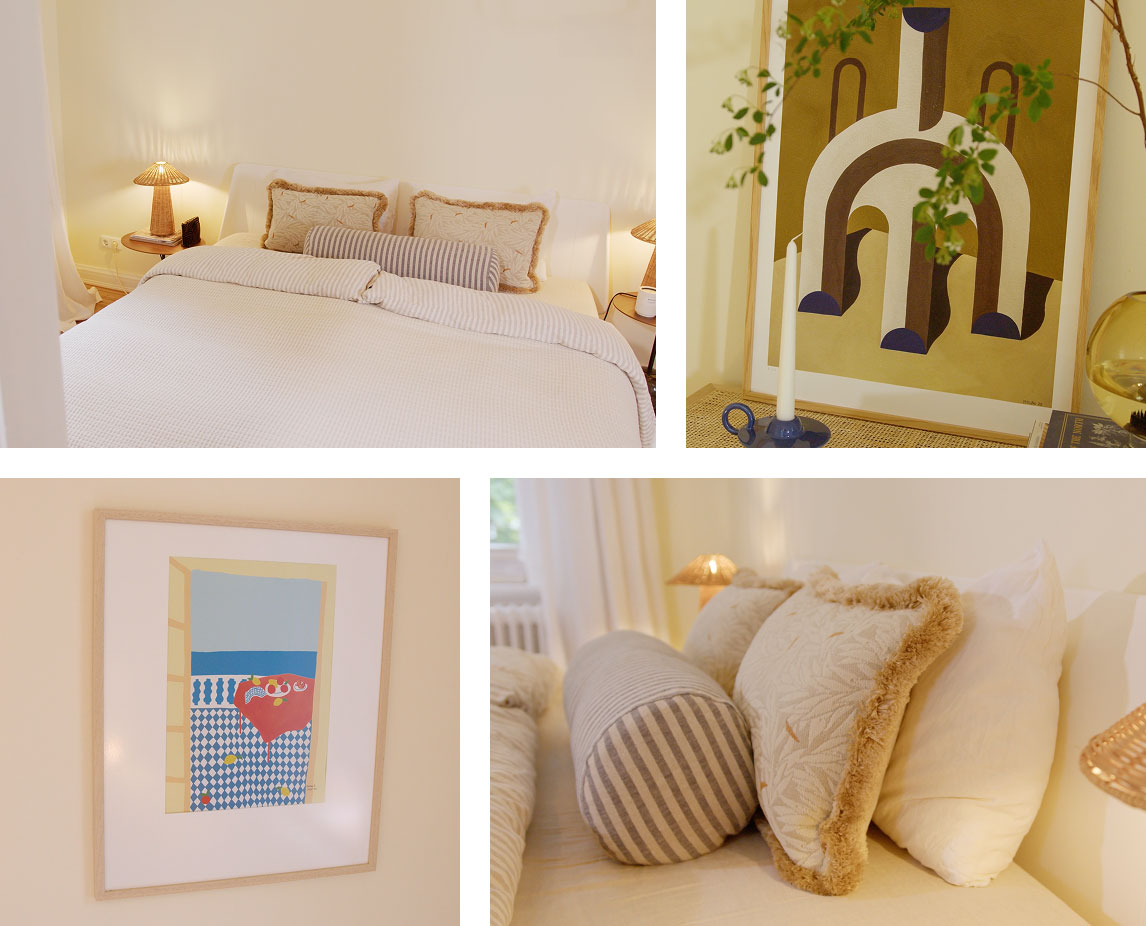 Für Urlaubsstimmung sorgt hier nicht nur der gestreifte Bettbezug, sondern vor allem die Naturell Kreidefarbe Sommertag an den Wänden. Das Hellgelb steckt voller Energie und bringt den Raum auch an grauen Tagen zum Strahlen. Ins Auge fällt auch die Lampe an der Decke. Das Objekt – ein schmales Holzgerüst, bespannt mit weißem Stoff – repräsentiert perfekt Johannas Liebe zu lockerer Natürlichkeit. Die Fransen an den Kissen wiederum sorgen für eine Portion Pomp, sodass auch hier mit der Spannung aus mediterraner Lässigkeit, Skandi-Optik und Eleganz gespielt wird.