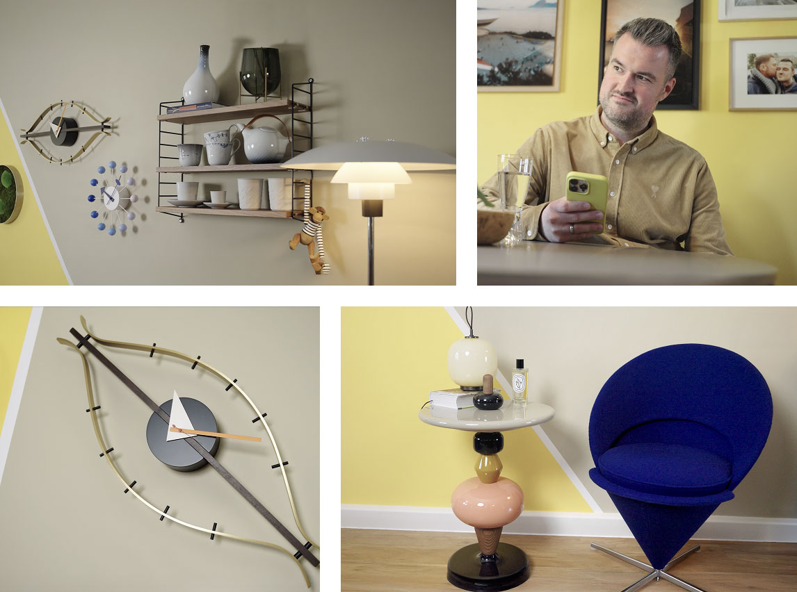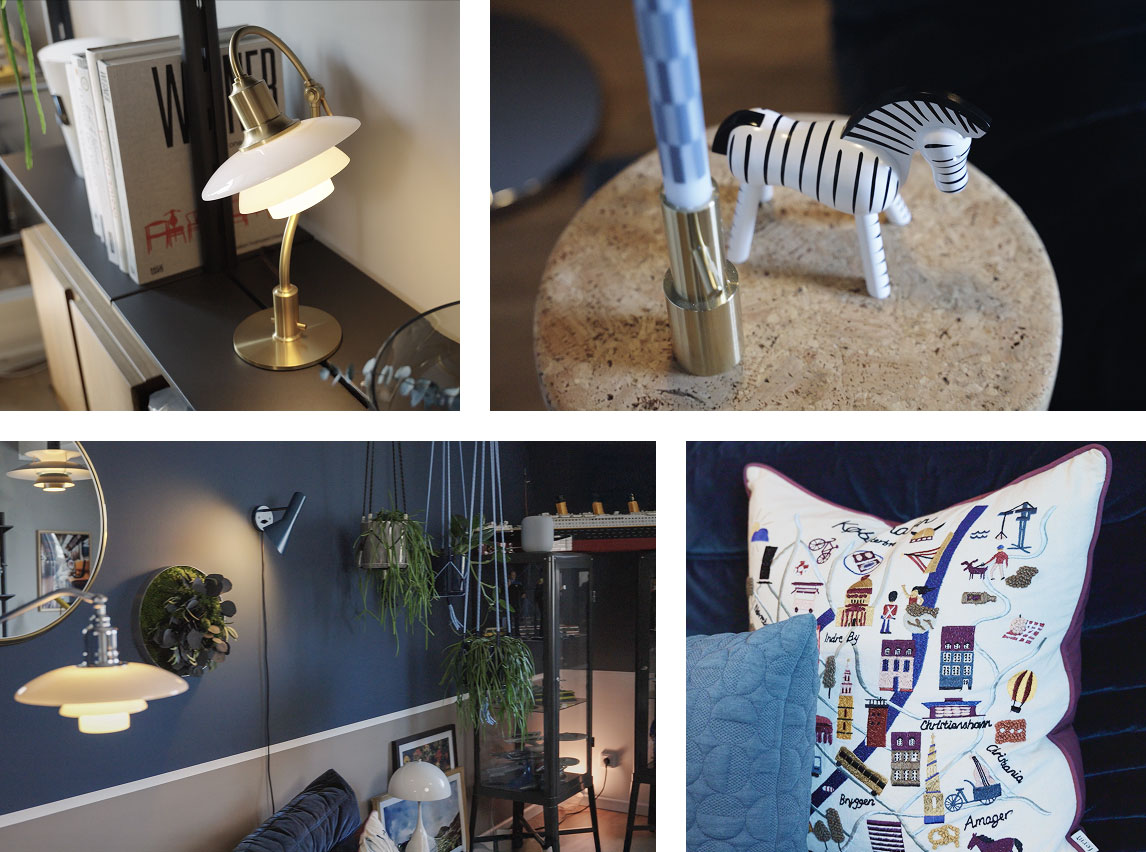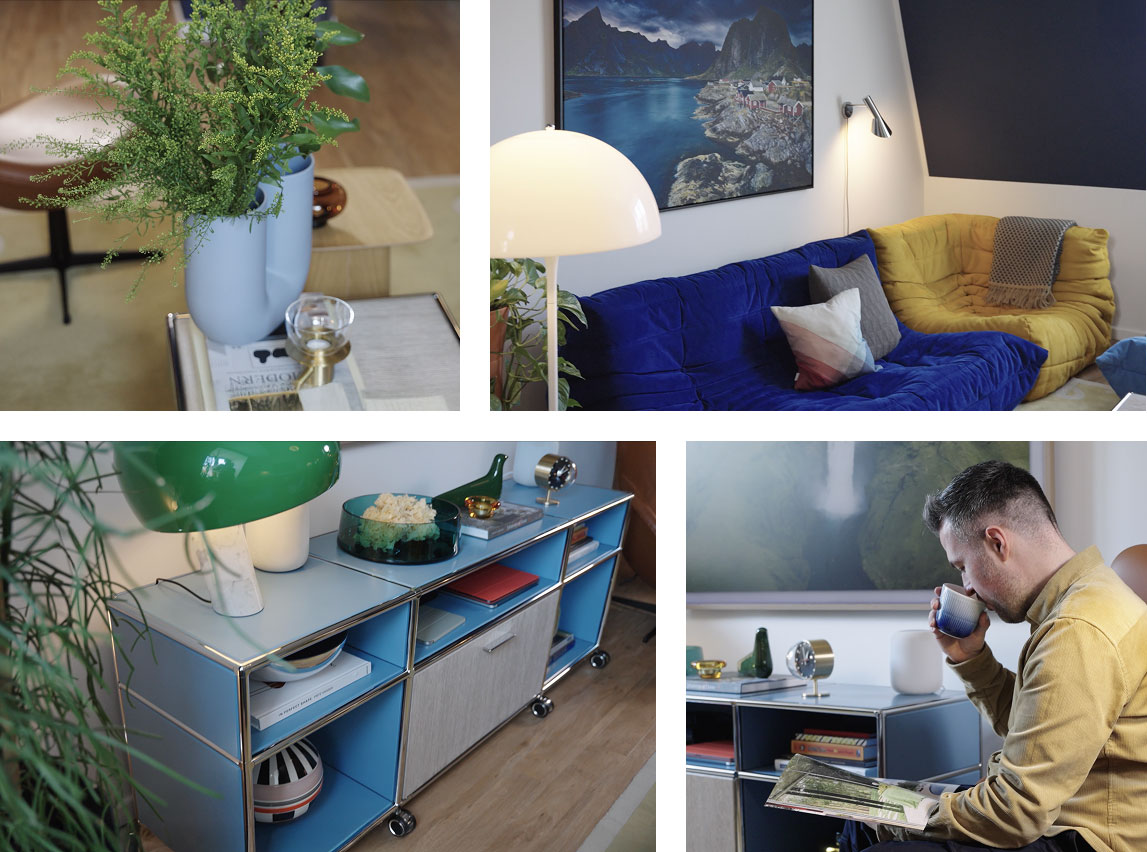 Mikes absolute Lieblingsfarbe ist Blau. Diese Farbe lässt sich super mit anderen Farbtönen kombinieren. Seite an Seite mit Blau leben Petrol, Curry und Türkis so richtig auf. Mike hat außerdem ein Faible für Kopenhagen und Designstücke. Das merkt man an den dänischen Klassikern, die sich überall in der Wohnung finden: Stringregale, Kay Bojesen-Affen, der auffällige Egg™-Sessel von Arne Jacobsen und natürlich die verschiedenen Louis Poulsen-Leuchten.