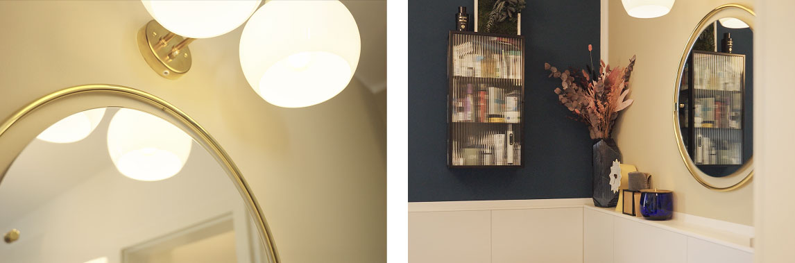 Im Badezimmer steht die Gemütlichkeit im Vordergrund. Mike schafft mit der Mischung aus Designfarbe Verträumtes Wüstenbeige Nr. 13 und der Polarweiss Mix Riviera ein wohnliches Ambiente. Goldene Elemente, wie der Rahmen des Spiegels, sowie Accessoires aus Holz und auch Trockenblumen unterstützen den Effekt.