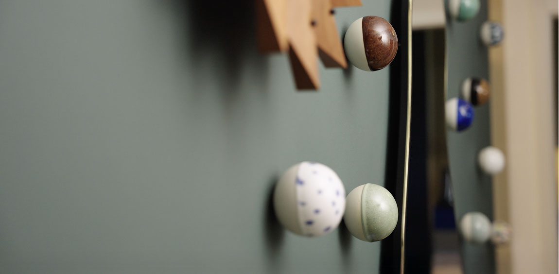 Auch im Flur strahlt die Einrichtung eine charmante Naturverbundenheit aus. Die Tapete mit Birkenwald-Motiv verstärkt diesen Eindruck zusammen mit der kraftvollen Designfarbe Besinnliches Waldgrün Nr. 26. Ein besonderes Highlight sind die bunten Keramikkugeln aus Kopenhagen, die hier an der Wand hängen. Gerade in kleineren Räumen sind sie eine tolle Alternative zu großen Bildern.