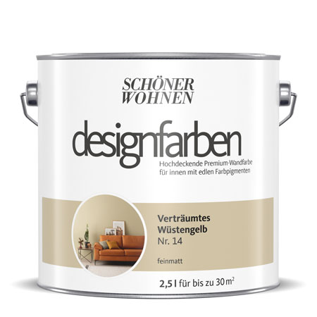Im Wohnbereich harmoniert die beruhigende Designfarbe Unendliches Tiefseeblau Nr. 21 mit den vielen anderen Blautönen im Raum. Kissen und Accessoires wie Vasen und Kerzenhalter greifen das Farbthema immer wieder auf. Der gelbe Teppich zeigt, wie sehr Farben das Raumgefühl beeinflussen – nicht nur an den Wänden. Mike weiß das ganz genau und nutzt diesen Effekt, indem er Wand- und Wohntextilfarben smart miteinander kombiniert. Verbindende Elemente zwischen den beiden Räumen sind die warme Designfarbe Verträumtes Wüstenbeige Nr. 13 und die geometrische Gestaltung der Wandflächen.