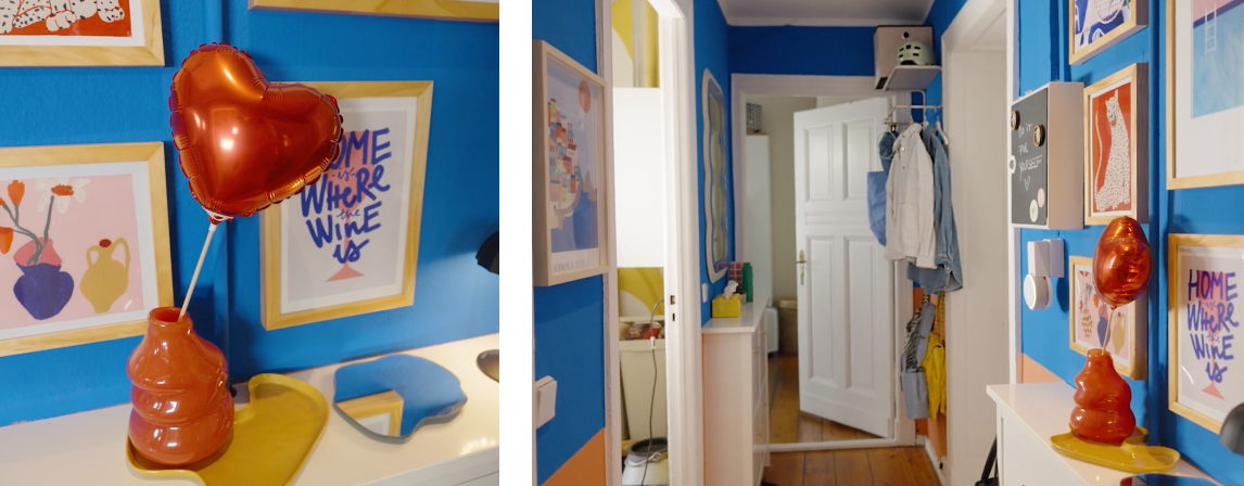 Für Juliane ist der Flur besonders wichtig. Schließlich ist dieser Raum das Erste, was Gäste zu sehen bekommen. Diese Gelegenheit nutzt die Stylistin und zeigt direkt, was ihren Stil so einzigartig macht. Auch hier fallen sofort wieder die verschieden großen Bilder und witzigen Dekoelemente ins Auge. Aber der wahre Hingucker ist natürlich die Wandgestaltung. Dazu hat sich Juliane SCHÖNER WOHNEN Polarweiss in zwei verschiedenen Farbtönen anmischen lassen. Der obere Bereich der Wände leuchtet in Kornblumenblau, der untere erstrahlt in einem warmen Terracotta – was für eine Kombination!