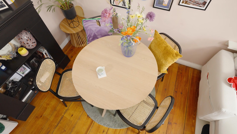 Juliane steht auf runde und geschwungene Formen. Der Tisch in der Essecke lädt zum Quatschen und Lachen ein. Quirlige Accessoires wie Lavalampe, bunt bedruckte Kissen, verschieden große Bilder an den Wänden sowie auffällige Vasen mit farbenfrohen Blumen bilden zusammen eine wunderbar lebendige Einrichtung.