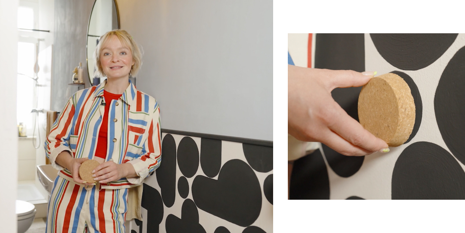 Das Badezimmer der kleinen Wohnung in Berlin ist – typisch für einen Altbau – recht schmal. Aber davon hat Juliane sich nicht abhalten lassen und die Wände mit einem Blaugrauton (Farbton Hochzeitsblau) gestrichen. Der Clou sind hier die runden und ovalen Formen, gestrichen in der Trendfarbe New Black. Die hat Juliane selbst gestaltet und auf die Wand gebracht, als eine kreative Alternative zur Mustertapete.
