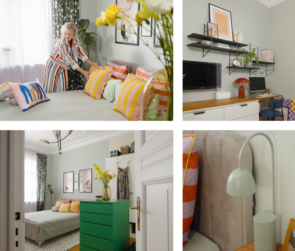 Im Schlafzimmer ging es darum, die richtige Balance zwischen Entspannung und Konzentration zu finden, denn neben dem gemütlichen Bett gibt es hier einen kleinen Arbeitsplatz. Die Wände des Raums hat Juliane daher mit unserer Designfarbe Harmonisches Jadegrün gestrichen. Der Farbton wird beiden Funktionen des Raums mehr als gerecht. Neben den gemusterten Vorhängen in Grün, fällt die neongrüne Kommode ins Auge – ein echtes Highlight, das perfekt zum eleganten Jadegrün passt und der Energie des Raums eine aufregende Facette hinzufügt.