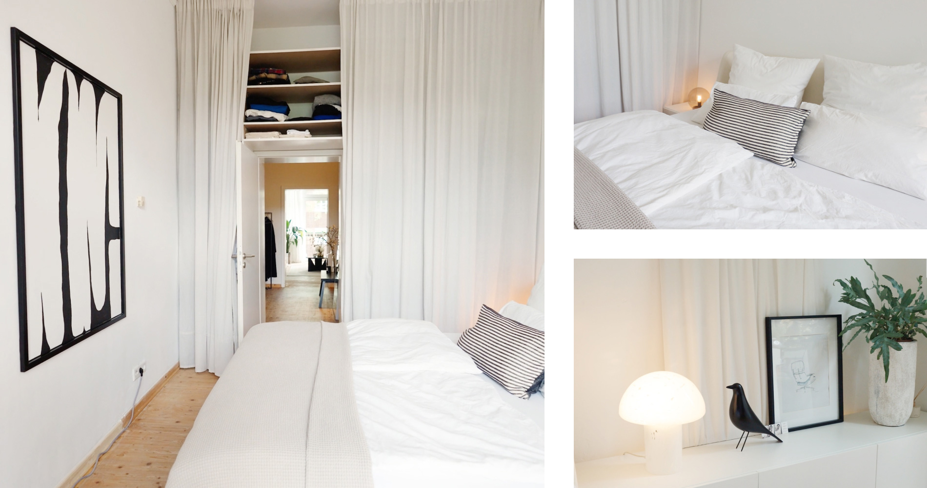 Das Schlafzimmer ist der Ort, an den sich Elisa und ihr Freund zurückziehen, um zur Ruhe zu kommen. Die Wände sind all over mit Polarweiss gestrichen. Das Weiß verleiht dem eher kleinen Raum eine aufgeräumte Klarheit. Dabei helfen auch die Textilien an den Seiten, die eine gewisse Gemütlichkeit in den Raum bringen.