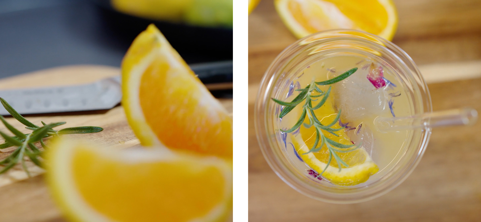 Alles mischen und auf sommerlichen Eiswürfeln servieren. Für die bunten Eiswürfel gibst Du Wasser mit Rosmarin-Zweigen, Orangenstücken und Blüten in die Eiswürfelform.