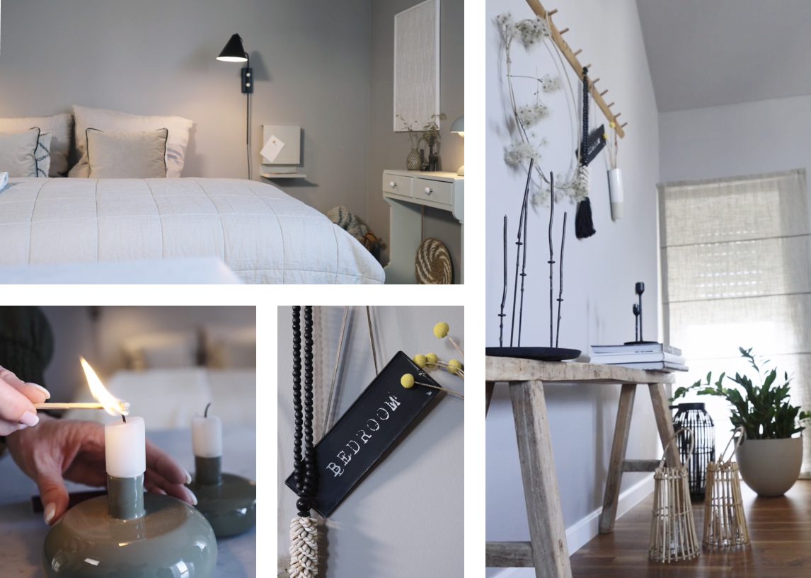 Für Räume wie diesen ist es wichtig, die Möbel und die Wandfarbe so auszusuchen, dass eine Atmosphäre von Ruhe und Entspanntheit entstehen kann. Das Bett steht hier in einer Art Schlafnische, die optisch vom restlichen Raum abgetrennt ist, indem Miriam Wände und Decke in einem eigenen Farbton gestrichen hat: das weiche Graubeige Küstennebel von SCHÖNER WOHNEN Naturell Kreidefarbe. Der etwas dunklere Ton lässt die Schlafnische gemütlicher wirken und das matte Oberflächenfinish passt perfekt zu den Einrichtungsaccessoires aus Holz und Textilien.