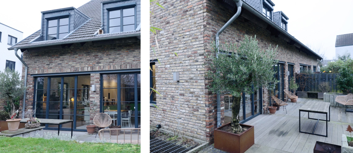 Rheinische Vierkanthöfe umschließen traditionell einen kleinen Innenhof, der durch ein Tor zugänglich ist. In einem der vier Einheiten lebt Laura mit ihrer Familie. Der Wohnbereich und die offene Küche nehmen fast die gesamte Fläche im Erdgeschoss ein. Es handelt sich dabei um den ehemaligen Reitstall des Hofes. Der Raum ist dadurch sehr großzügig und verfügt über gleich zwei Eingänge – einen zum Hof und einen zum Garten. Mitten im Wohnzimmer ist sogar Platz für eine Indoor-Schaukel, die besonders für ihre Kinder ein Highlight darstellt! Einen so großen Raum zu gestalten, ist gar nicht so leicht. Ausgewählte Wände in kräftigen Farben geben dem Auge Halt und sorgen für Gemütlichkeit.