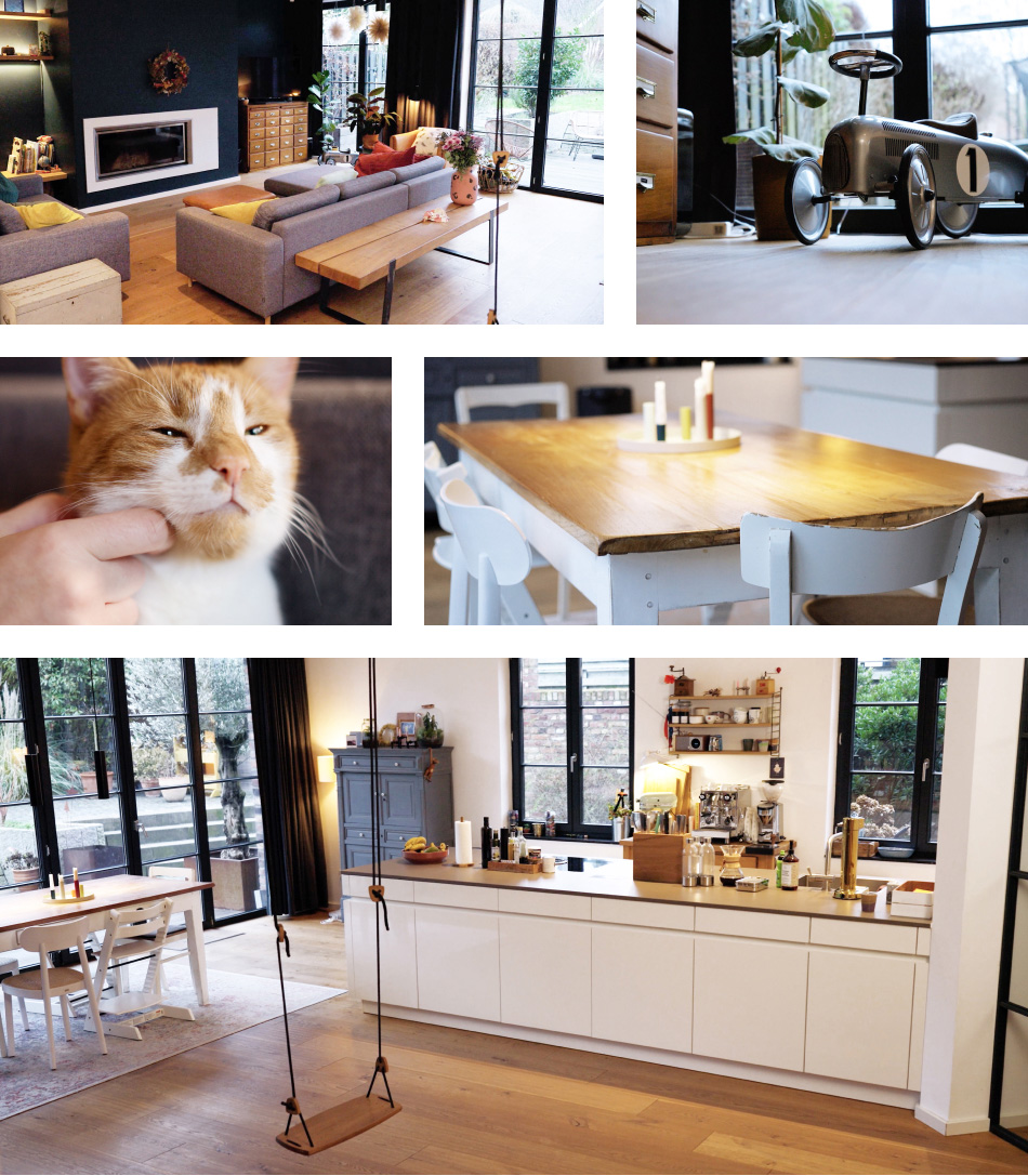 Eine schwarze Industrietür trennt den Garteneingangsbereich vom Wohnbereich ab und unterstreicht den Loft-Charakter des Erdgeschosses. Dazu passend arrangiert Laura alte Möbel mit Charakter. So besticht der Wohnraum mit sehr viel Charme und hat sich schnell zum Herz des Hauses entwickelt. Hier trifft sich die ganze Familie, es wird gekocht, gespielt, gearbeitet und gefaulenzt.
