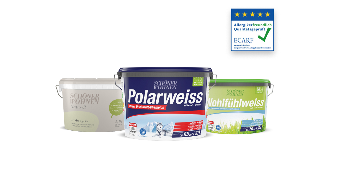 In Deutschland ist heute fast jeder Dritte von Allergien betroffen. Gut zu wissen, dass Allergiker im Sortiment von SCHÖNER WOHNEN-Farbe diverse Innenwandfarben in konservierungsmittelfreier Qualität finden. Wir haben ausgewählte Produkte im Hinblick auf ihre Allergikereignung auch durch die Stiftung ECARF* prüfen lassen, deren Qualitätssiegel seit 2006 allergikerfreundliche Produkte und Dienstleistungen auf dem europäischen Markt auszeichnet. Die Innenwandfarben SCHÖNER WOHNEN Wohlfühlweiss sowie unser Deckkraft-Champion SCHÖNER WOHNEN Polarweiss erfüllen die hohen Qualitätsanforderungen der Stiftung ECARF und tragen deshalb das ECARF-Signet. Das Zeichen unterstreicht die besondere Funktion und Qualität unserer Innenwandfarben.