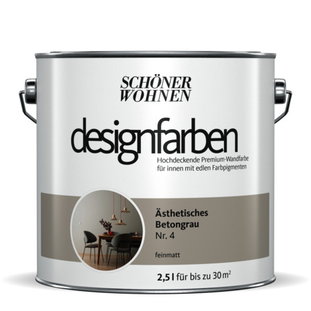 Hochdeckende, scheuerbeständige und wasserdampfdurchlässige Dispersionsfarben für innen und die richtige Wahl für Neu- und Renovierungsanstriche. Die Rezeptur mit Spritzfrei-Formel ermöglicht ein Streichen ohne oder nur mit wenigen Farbspritzern. SCHÖNER WOHNEN Designfarben haben eine sehr gute Farbbeständigkeit und können vielfältig verwendet werden, z.B. auf Raufaser- und Prägetapeten, alten Dispersionsfarbenanstrichen, Gipskartonplatten sowie Mauerwerk, Putz und Beton. Nach vorheriger Grundierung mit der SCHÖNER WOHNEN Designfarben Grundierfarbe sind die SCHÖNER WOHNEN Designfarben auch für dekorative Anstriche auf Holz, Kunststoff und Nichteisenmetallen geeignet (Beispiele: Stuckleisten, Bilderrahmen, Holzpaneele, Dekorationsleisten, Bilderleisten).